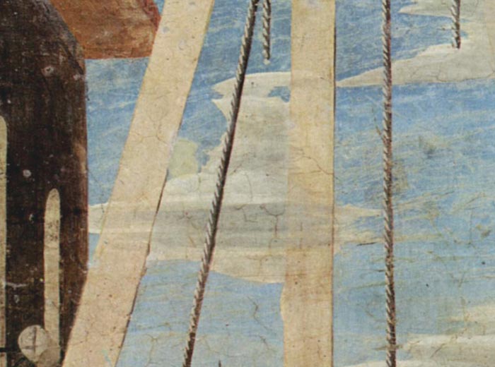 Piero has encapsulated these events by focusing on the workmen who know nothing of their mission. He creates what appears to be a genre scene, again with implied relationships across the corner. On the right, the back-side of the drunken workman is juxtaposed and thereby equated to the hindquarters of a horse on the adjacent wall. Another nearby horse “laughs” at this interaction. At the same time, the lead worker, who exposes his nether parts, is made to prophesy the future function of the wood by taking the pose of “Christ Carrying the Cross,” even having a kind of halo in the grain of the wood behind his head. The diagonal of the plank extends beyond the frame, leading down to the next scene in the sequence. |