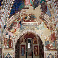 The remarkable pictorial cycle begins in the apse with scenes of the martyrdom of the Saint. Two artists, as recently distinguished by experts, worked on this section. They were the so-called Maestro di Barberino, anonymous painter in the style of Orcagna, and Pietro Nelli (a student of Bernardo Daddi), who was able to mitigate the angularity of the first master by means of an elegant plasticity.