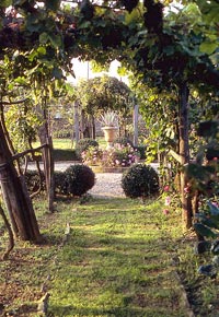 The garden is divided into two areas: the one in front of the villa is known as the Piazzone, the other is the kitchen garden. The Piazzone is laid out parallel to the front of the building, with large lawns at the sides edged with low box hedges and ending at the southern end in the 18th-century teatro di verzura.The entire garden is surrounded by a high wall into which six gates open, flanked by monumental pillars crowned by terracotta vases and statues of monkeys. There are two openings to the south, at the sides of the theatre, two to the west, leading into the kitchen garden, one to the east, leading out to the countryside and one to the north, alongside the villa. The kitchen garden, which occupies a square portion of land to the west, ends in a semi-circular brickwork fishpond and is organised as an Italian-style garden with geometrical beds arranged around a well.