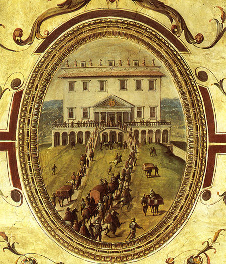 The Villa Medicea at Poggio a Caiano was built by Lorenzo dè Medici and his heirs from the design of Giuliano da San Gallo between 1485 and about 1520, with a probable break in construction from 1495 to 1513 on account of the exile of the Medici from Florence. It always remained the summer residence of the Medici, and, other than hosting numerous notable personalities, it was a stage for the important events in their history, such as the weddings of Alessandro dè Medici and Margherita d'Austria (1536), Cosimo I and Eleonora da Toledo(1539), and that of Francesco I and his lover Bianca Cappello (1579).